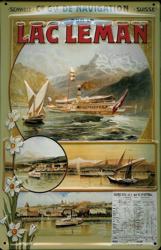 Blechschild Lac Leman Alpensee Fähre Fahrplan Schiffe Dampfer Schiff Schild Nostalgieschild Berge