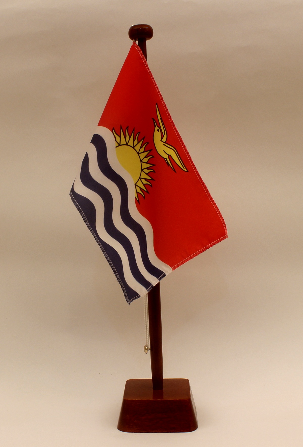 Mahagoni-Ständer: in Handarbeit mehrfach grundiert, geschliffen und lackiert. Der Fahnenmast ist leicht konisch gedrechselt und wird in das eckige Unterteil (ca. 8,5 x 8,5 x 3,5 cm) gesteckt.