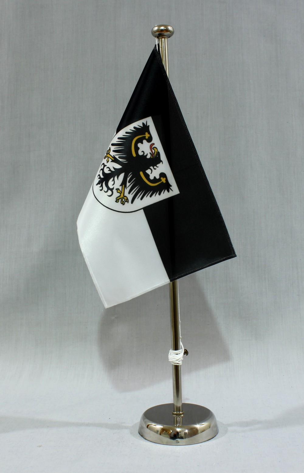 Chrom-Ständer: aus Metall verchromt, sehr schwere Ausführung. Höhe 44 cm. Der Fahnenmast wird in den runden Sockel (ca. 9 cm Durchmesser) Unterteil geschraubt.
