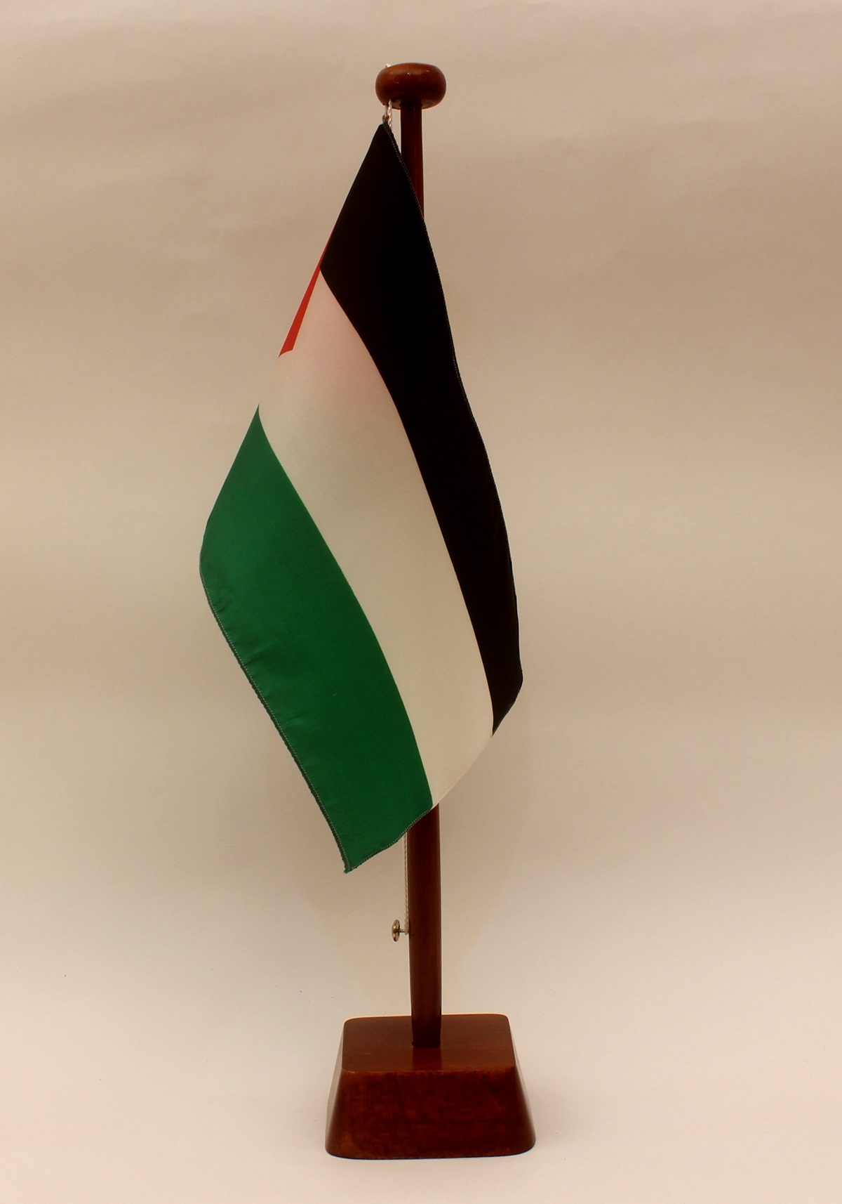 Mahagoni-Ständer: in Handarbeit mehrfach grundiert, geschliffen und lackiert. Der Fahnenmast ist leicht konisch gedrechselt und wird in das eckige Unterteil (ca. 8,5 x 8,5 x 3,5 cm) gesteckt.